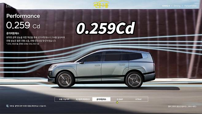 최대 토크 315kW와 700Nm의 압도적인 성능을 자랑하는 아이오닉 9은 기존 전기차들을 능가하는 동력성능을 발휘한다. 또한 공기 저항 계수 0.259Cd로 뛰어난 공력 성능을 보여주며, 이는 전비 효율 향상으로 이어진다.