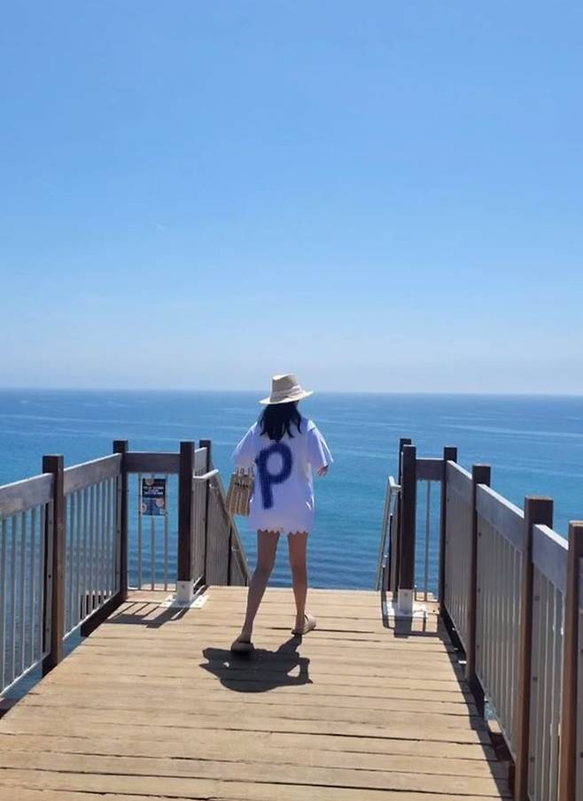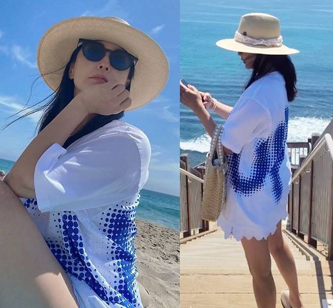 공개한 사진에서 김희선은 하의를 안입은 듯 짧은 화이트 쇼츠에 오버핏 화이트 티셔츠를 착용한 하의실종 스타일에 라탄백과 파나마햇을 매치한 비치룩으로 휴양지 분위기를 드러냈다.