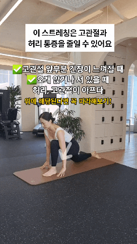 앞쪽 다리는 'ㄱ'모양 뒤에 다리는 'ㄴ'모양 자세에서 골반을 앞으로 밀어줍니다.