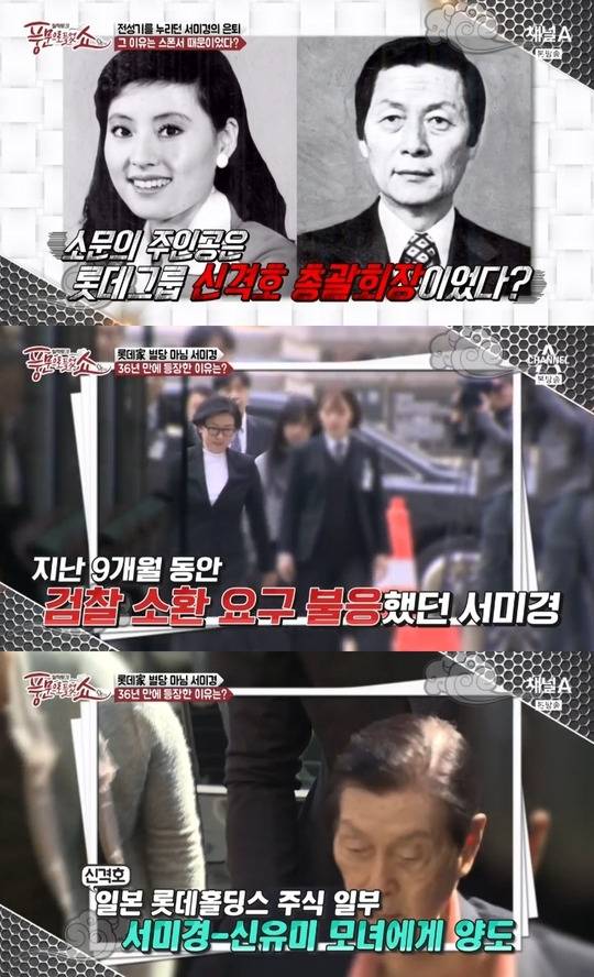 2017년 방송된 채널A '풍문으로 들었쇼'에서 출연진은 재벌이 사랑한 스타들을 주제로 대화를 나눴습니다. 서미경은 롯데그룹 신격호 총괄회장과 사실혼 관계에 있는 것으로 알려진 제1회 미스롯데 대상 출신 배우로 서미경과 신격호는 한때 서울 명동 미용실 등지에서 데이트한다는 소문에 휩싸인 바 있습니다. 이후 서미경은 신격호 총괄회장이 자신의 스폰서라는 루머를 강력하게 부인했습니다.