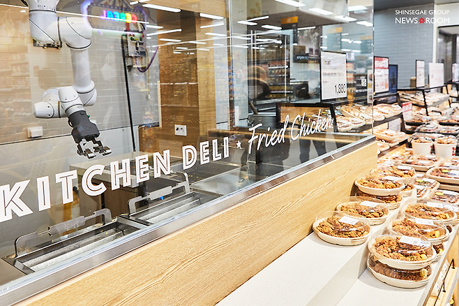 연수점 델리 코너를 리뉴얼하는 과정에서 조리로봇의 도입을 기획하게 된 의도는 크게 세 가지입니다. 표준화와 효율성 증대 그리고 고객 경험을 강화하는 것이죠. 먼저 표준화 관점에서 조리로봇은 튀김의 퀄리티를 결정하는 반죽, 튀김유의 산도와 온도, 튀김 시간 변수를 최소화하여 고객에게 ‘정확한 레시피로 만든 균일한 품질의 상품’을 제공할 수 있다는 장점이 있어요.