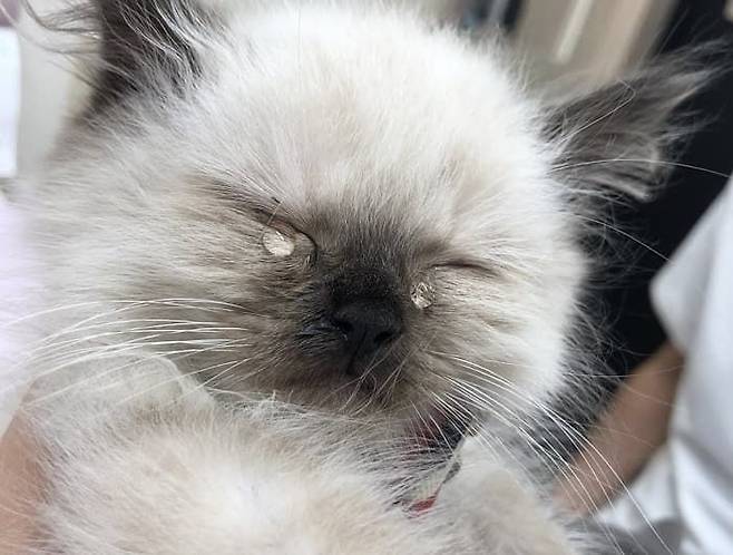 두 눈을 지그시 꼭 감고 눈물을 또르르 흘리는 아기 고양이의 모습이 카메라에 고스란히 포착돼 보는 이들의 마음을 안타깝게 합니다.