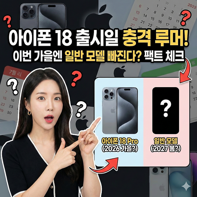 가장 유력한 시나리오는 이렇습니다.아이폰18 Pro와 Pro Max는 예정대로 2026년 9월에 출시, 반면 일반 아이폰18은 2027년 봄 출시 가능성이 거론되고 있습니다.