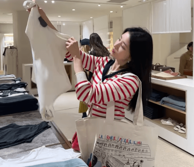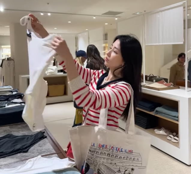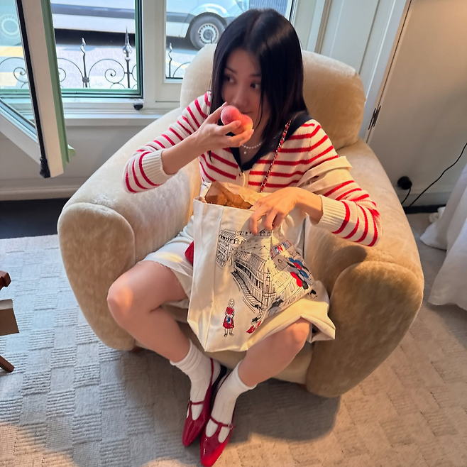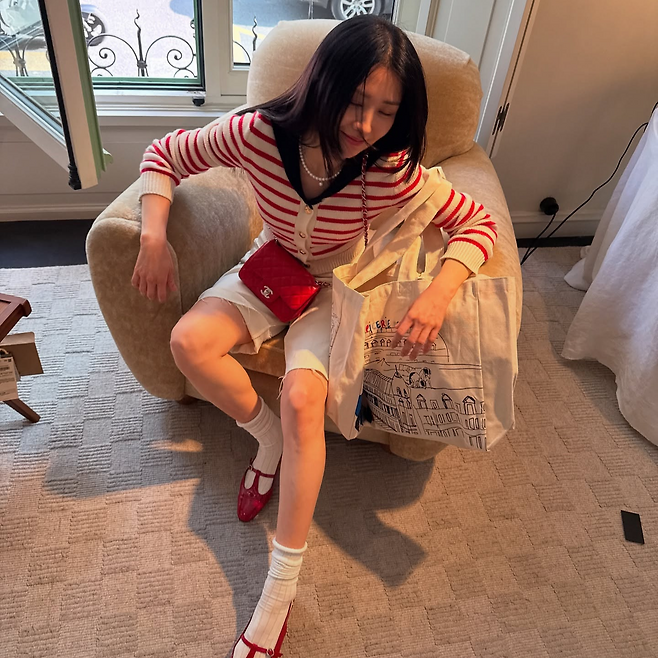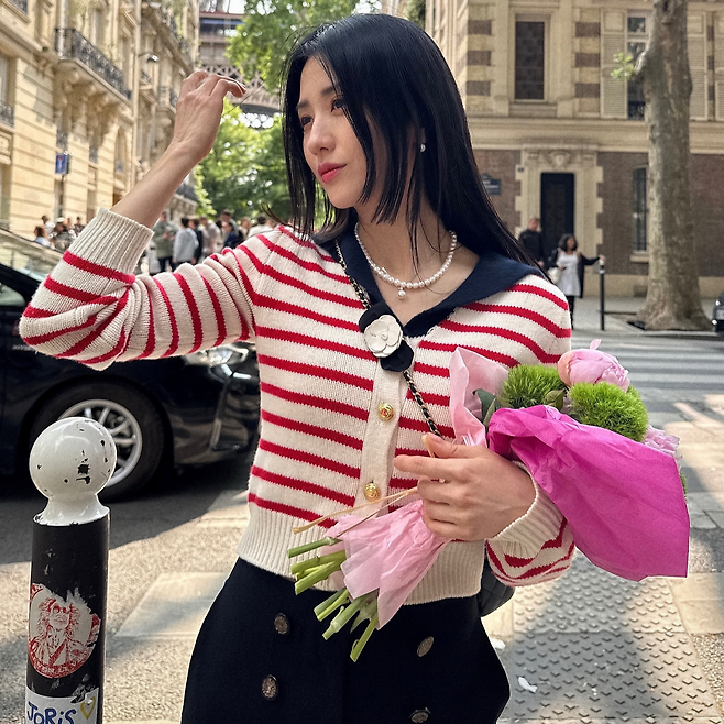 사진 속 박하선님은 프렌치 감성이 물씬 풍기는 레드와 크림 컬러의 스트라이프 니트에 반바지를 매치해 대학생 여친 같은 청순하면서도 발랄한 쇼핑룩을 선보였습니다. 그녀의 밝고 경쾌한 모습은 파리의 거리와 잘 어우러졌습니다. 🎨✨
