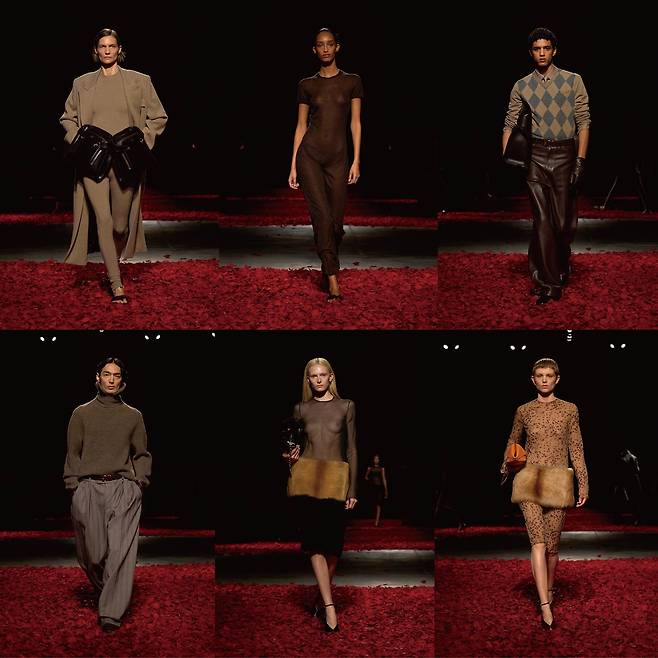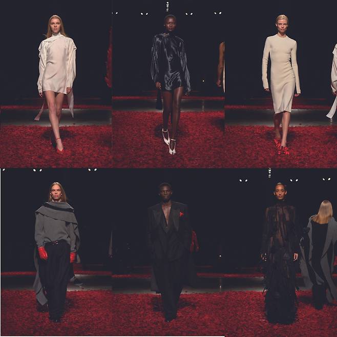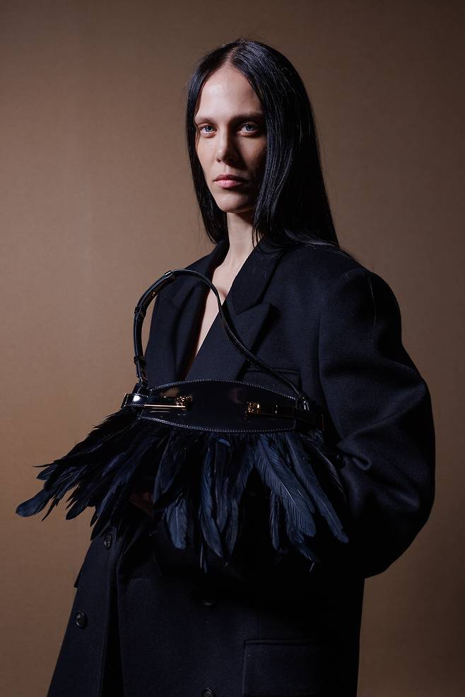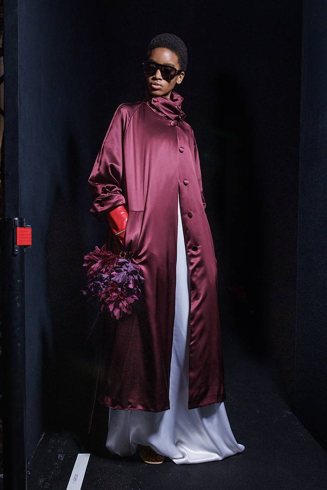 컬렉션의 형태와 소재를 더욱 면밀히 살펴보면 탄츠테아터 부퍼탈 무용단(Tanztheater Wuppertal)의 공연에서 느낄 수 있는 감성적인 대조, 이를테면 사랑과 갈망, 자유와 통제, 낭만과 열정의 개념이 읽힌다. 유려한 실루엣의 새틴 트렌치코트는 몸에 밀착된 벨트로 조여지며, 부드러운 캐시미어는 은은한 광택이 돋보이는 가죽과 나란히 놓여 강렬한 대비를 이룬다. 평평하게 세팅한 깃털은 새로운 질감을 형성하고, 리본 형태의 줄기에서 피어난 양귀비 꽃이 우아한 흐름을 연출하기도.