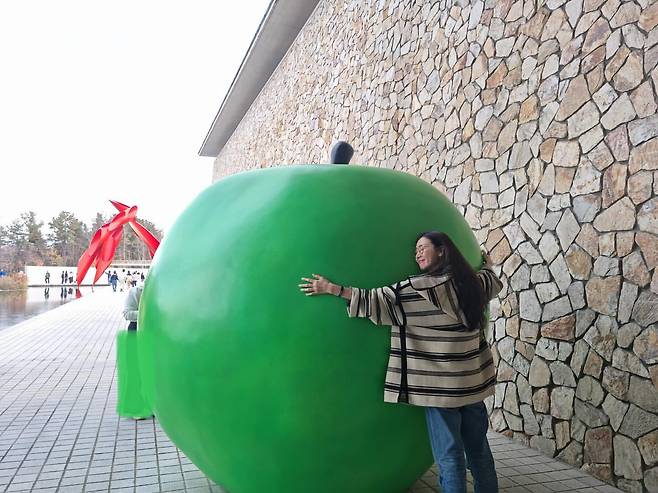 최지우가 미술관으로 추정되는 장소에서 편안한 스트라이프 패턴의 오버사이즈 코트를 선보이고 있다. 베이지와 블랙의 조화가 돋보이는 이 코트는 여유로운 실루엣으로 캐주얼하면서도 세련된 느낌을 연출한다. 청바지와 함께 매치해 자연스러운 데일리 룩을 완성했으며, 대형 조형물과 함께한 포즈가 그녀의 유쾌한 매력을 더하고 있다.