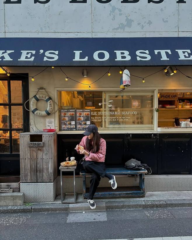 뉴욕 분위기가 물씬 느껴지는 로브스터 레스토랑 앞에서 최지우가 핑크 재킷과 블랙 팬츠의 조합으로 시크한 스트리트 패션을 선보이고 있다. 캐주얼한 모자와 편안한 스니커즈로 마무리한 이 룩은 도시적인 감각과 실용성을 동시에 갖추었다. 간편하게 즐기는 식사 장면에서도 스타일리시한 면모를 잃지 않는 그녀의 패션 센스가 돋보인다.