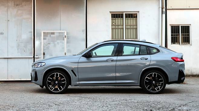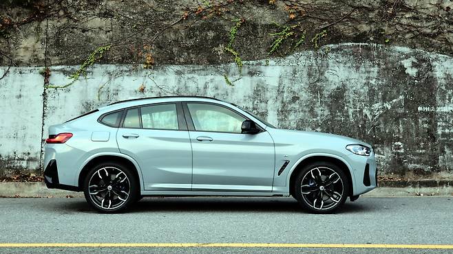X4의 핵심은 측면 디자인에 있다. 마치 스포츠 쿠페처럼 유연하게 주저앉는 루프라인이 인상적이다. 창문 하단 벨트라인의 시작점을 낮추고, 뒤로 갈수록 상승하도록 하여 더욱 역동적인 프로필을 만들었다. 앞서 언급했던 짧은 프런트 오버행과 길게 뻗어있는 휠베이스는 비율적으로도 훌륭해 보인다. 바디 컬러 클래딩까지 꼼꼼하게 적용했으며, 옆에서 바라보아도 과시적인 느낌을 주는 범퍼, 에어 브리더와 21인치 더블 스포크 휠의 조화가 마음에 든다. 특히 휠 사이로 비치는 M 스포츠 브레이크 캘리퍼가 매력적인 디자인 포인트 중 하나였다.