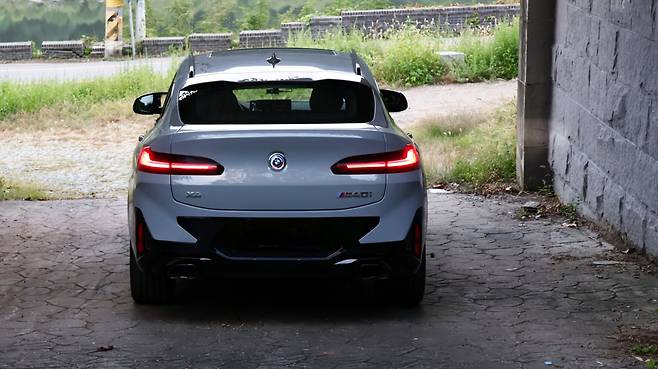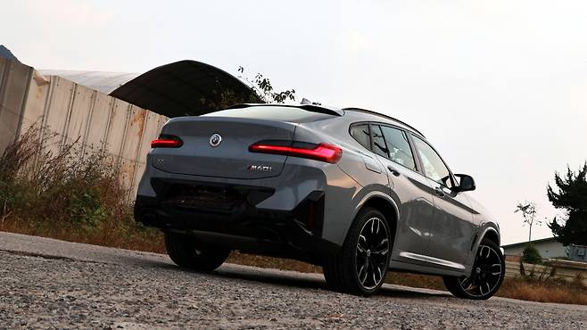 쿠페의 매력은 후면 디자인까지 연결된다. 일반적인 SUV와 다르게 트렁크 끝단이 돌출되어 있고, 아치 형태로 부드럽게 뻗어나간다. 한껏 부풀려져 있는 리어 펜더가 매력적인 실루엣을 보여주게 된다. 루프 끝부분을 장식하는 플로팅 스포일러도 멋을 더하며, 그 아래의 창문도 면적이 낮고 넓게 뻗어있다. 개인적으로 BMW X4의 테일램프 디자인도 정말 마음에 드는 부분이었다. X3와 가장 차별화된 디자인 요소이며, 쿠페 특유의 늠름하고 카리스마 있는 첫인상을 실현해 준다. 머플러는 듀얼 팁으로 구성되어 있다.