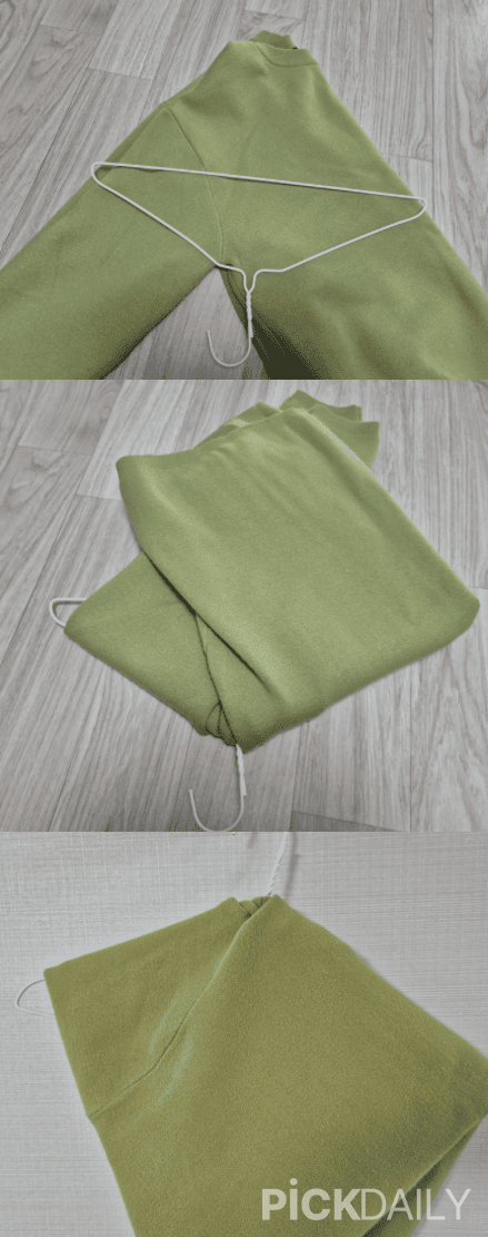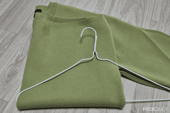 옷걸이에 니트를 거는 또 따른 방법은 이렇습니다. 아까와 같이 니트를 반으로 접어 준비해주세요. 그다음 옷걸이를 올려주는데, 이번엔 겨드랑이보다 조금 아래 위치에 옷걸이를 올려놓아주세요. 그다음 아랫단을 옷걸이 사이로 끼워넣어주세요. 이후 위에 있는 팔 부분은 아래로 끼워넣어준 뒤, 옷걸이의 고리 부분을 들어주면 사진과 같은 모양이 완성됩니다. 이 방법들은 세탁소 옷걸이를 이용해서도 니트를 걸 수 있어 좋습니다.