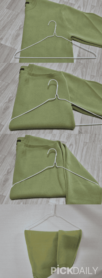 먼저 니트를 반으로 접어주세요. 니트의 겨드랑이 부분에 옷걸이를 거꾸로 놓아주세요. 이 상태로 밑단 부분과 팔 부분을 위로 올려 접어주면 옷걸이의 위쪽에 옷이 걸리게 되는데요. 이렇게 접어 걸어주면, 오랜시간 니트를 걸어놔도 니트가 늘어나지 않도록 보관 할 수 있습니다. 도톰한 니트여서 팔 부분이 자꾸 떨어진다면, 옷걸이의 밑부분에 끼워 넣어주면 간편하게 고정이 가능합니다.