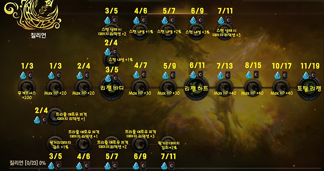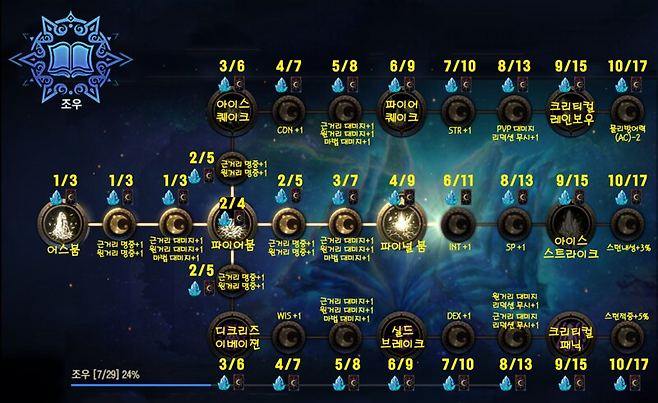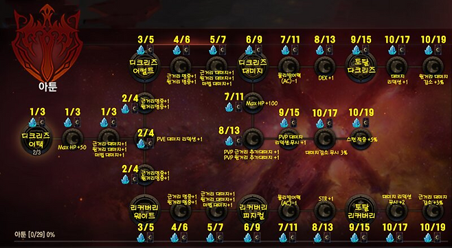 # 8. 수호성 대미지, 명중 위주로 챙깁니다. 이제 대 광역 시대이므로 파이널 붐은 찍지 않습니다. 파이어 붐에서 위로 올라가세요. 총사도 광역딜이 좋은 만큼 몹 선점을 위해 크리티컬 레인보우까지 가되 PvP를 고려하면 아래로 가도 됩니다. 아툰의 테크트리도 위로 가면 됩니다. 액티브가 아래는 회복, 위가 대미지 감소인데 회복보단 감소가 보여지는 이펙트가 다 멋있기 때문입니다. 효과는 도긴개긴이라서요.