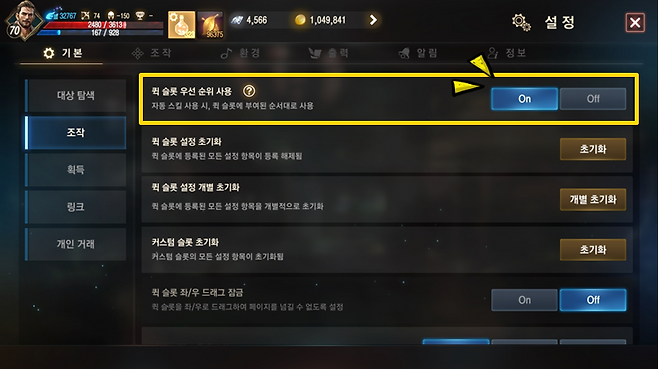 # 11. 자동 사냥 스킬 세팅 이유는 모르겠지만 간혹 실드, 홀딩 포지션이 사용되지 않을 때, MP 설정을 했음에도 아이스 런처와 래피드 샷을 제대로 쏘지 않고 마첸이 사용될 때가 있습니다. 첫 번째 현상은 공격 스킬보다 버프 스킬이 더 후순위 슬롯에 등록한 상태로 '퀵 슬롯 우선 순위 사용'을 ON으로 두었기 때문이며, 2번째는 현재 버그라 다시 설정해야 합니다. 해결법은 다음과 같습니다.
