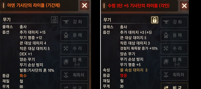 마력의 기운 1개 제작 : 마력의 조각 x100 + 불완전한 마력의 기운 x1 기사단 무기 제작 : 마력의 조각 x700 + 불완전한 마력의 기운 x1 = 마력의 기운 x7 불완전한 마력의 기운은 과말섬 내 판도라(NPC 텔레포트)에게 1개당 100만 아데나로 구매할 수 있습니다. 기사단 장비 1개당 700만 아데나가 필요합니다. 총사는 아덴 기사단의 라이플을 최대한 오래 써야 합니다. 영웅 기사단으로 제작 시 +5까지 인챈트하면 원거리 대미지가 8이나 빠집니다. 속성 작업을 해도 5의 대미지를 손해 보게 됩니다. 속성 카운터 사냥터가 아니라면 아덴 기사단을 쓰면서 파티 사냥이나 언데드 사냥을 할 때만 영웅 기사단을 스왑하면서 씁니다.