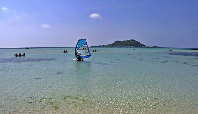 바다는 바닥까지 훤히 비칠 정도로 투명하고, 마치 파란 물감을 풀어놓은 듯 푸른빛이 선명하다. 눈앞에는 귀여운 섬 모양의 비양도가 자리해 이국적인 풍경을 완성한다. 모래사장은 촉감이 곱고 부드러워 맨발로 걸어도 기분이 좋으며, 아이들과 함께 모래놀이를 즐기기에도 알맞다.