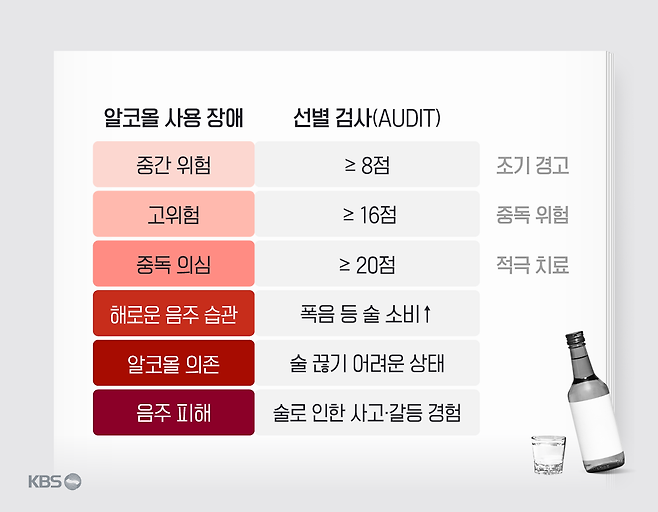 8점 이상이면 건강을 해칠 수 있는 ‘중간 위험 음주자’, 16점 이상이면 중독 위험이 높은 ‘고위험’, 20점 이상이면 ‘중독 의심’ 수준으로 평가했습니다.