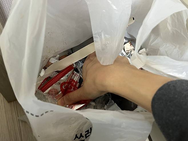 꽉 찬 쓰레기봉투는 손으로 아무리 세게 눌러도 더 이상 줄어들지 않는데요. 특히 봉지와 같은 부피 있는 것들은 다시 부풀어 올라 공간을 차지하게 됩니다.