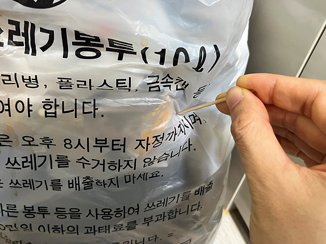 그럴 때는 이쑤시개 등 뾰족한 물건을 활용해 보세요. 쓰레기봉투 중간중간 구멍을 뚫어 공기를 빼줍니다. 송곳, 바늘 등을 활용하셔도 됩니다.