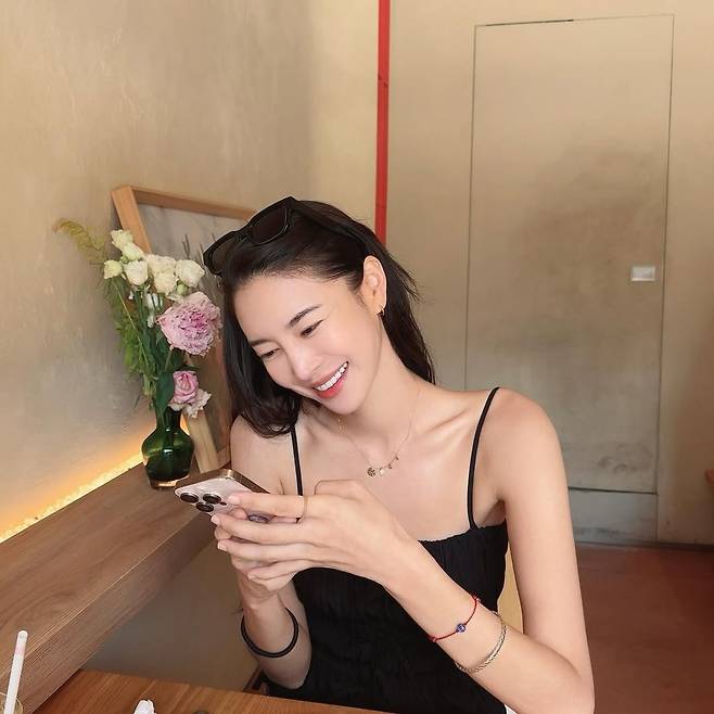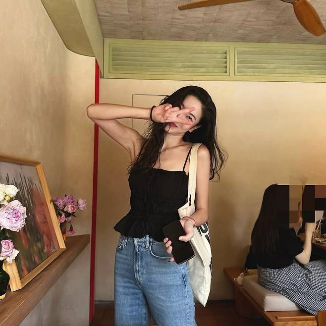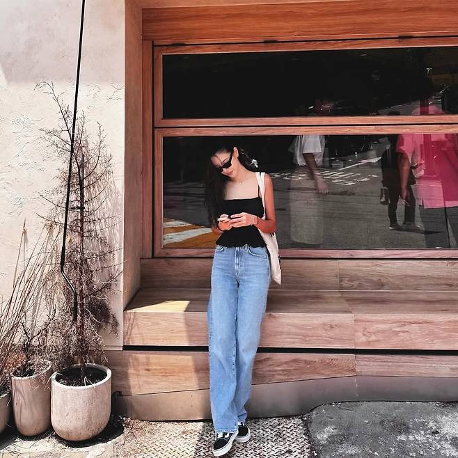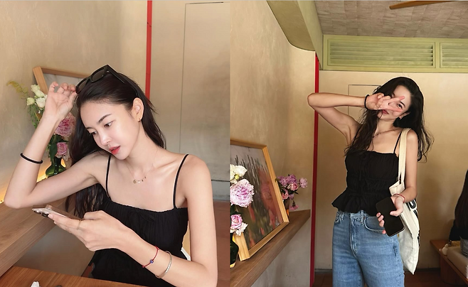 사진 속 그는 블랙 끈 슬리브리스 탑에 청바지를 매치해 자연스러운 꾸안꾸 룩을 완성, 한층 날렵해진 턱선과 가녀린 어깨라인이 눈길을 사로잡는다.