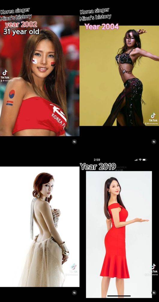 미나는 2002년 한일 월드컵 당시 모습으로 시작했다. 당시 31살이었던 미나는 긴 머리로 가슴만 겨우 가린 파격적인 화보로 글래머 몸매를 자랑했다. 미나의 몸매는 20년이 지나도록 변함이 없었고, 2018년 결혼 이후에도 탄력 넘치는 몸매를 자랑했다.
