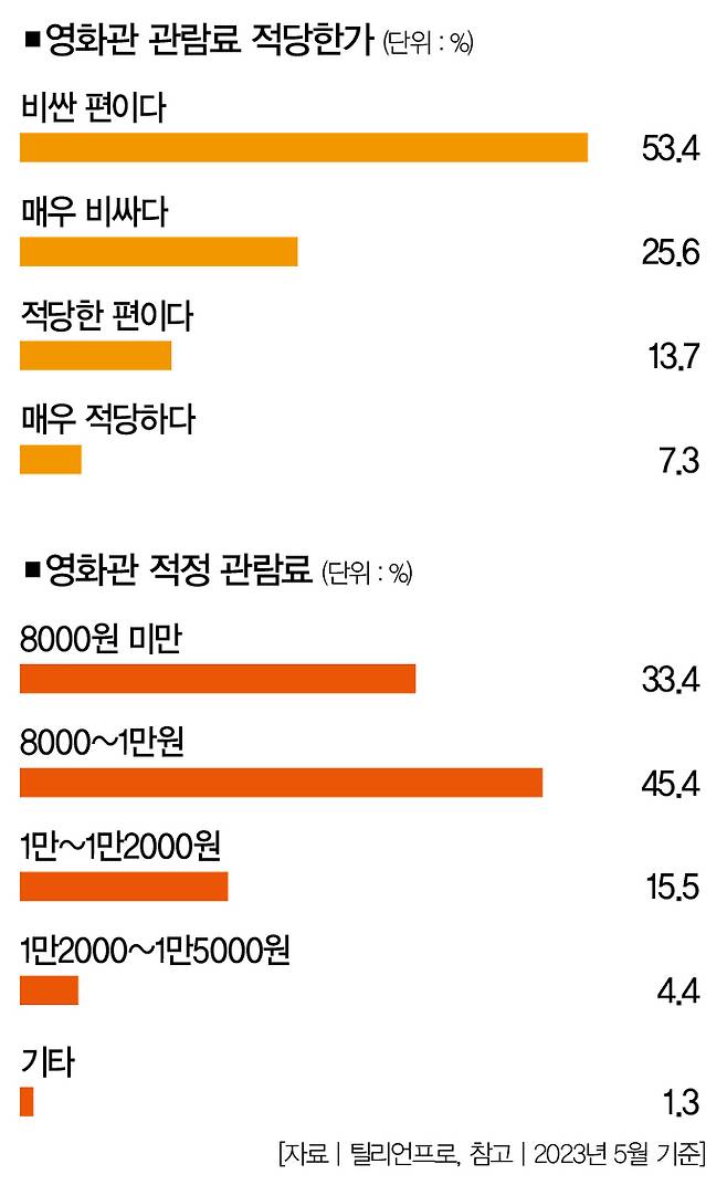 하지만 이 주장은 설득력이 없습니다. 설문조사 플랫폼 '틸리언프로'가 지난해 4031명을 상대로 조사한 결과를 살펴보시죠. '현재 영화 관람료가 적당한가'란 질문에 전체의 53.4%가 '비싼 편이다'고 답했습니다. '매우 비싸다'는 응답은 25.6%에 달했습니다. 사실상 10명 중 8명(79.0%)이 영화관 관람료를 비싸다고 느끼고 있는 셈입니다.