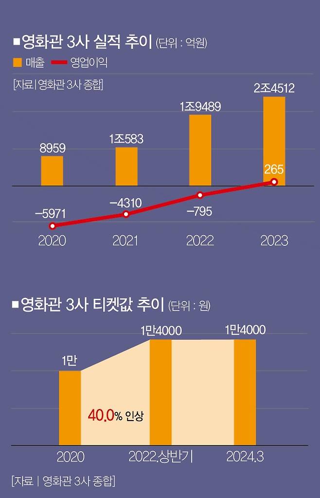 푯값을 인상한 덕분일까요. 팬데믹 국면에서 적자를 기록하던 영화관 3사의 실적도 빠르게 회복하기 시작했습니다. 매출은 2020년 8959억원에서 2조4512억원으로 크게 불어났고, 영업적자도 같은 기간 5971억원에서 265억원 흑자로 돌아섰습니다.
