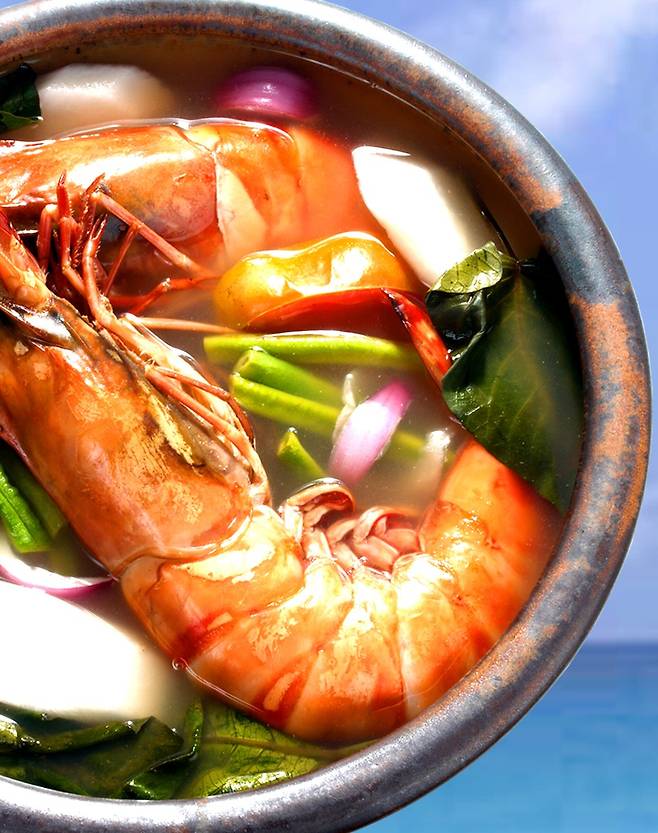 닭이나 소고기, 돼지고기를 간장과 식초 등으로 양념을 해 푹 끓인 요리로, 한국의 찜닭, 갈비찜과 비슷한 필리핀 대표 가정식이다. 한식의 달달한 조림 요리와 달리 식초로 새콤한 맛을 낸다는 점이 독특하다. 지역에 따라 재료 및 조리법이 매우 다양하며 향신료나 자극적인 소스를 사용하지 않아 외국 관광객들이 즐겨 찾는 음식 중 하나다. 필리핀 음식을 처음 도전한다면 무난하게 선택하기 좋다.2. 시니강 (Sinigang)