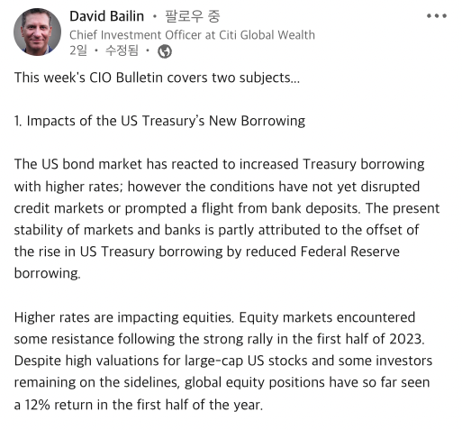 하반기에 상승장이 이어질지는 알 수 없는 상황입니다. 월스트리트에서도 다소 비관적인 전망이 나오고 있죠. 씨티 글로벌 웰스의 데이비드 베일린 최고투자책임자 역시 하반기에 대해 신중한 모습인데요. 그는 “2023년 상반기를 장식한 랠리는 저항에 직면해 있다”며 “S&P 500 지수가 두 자릿수 상승률을 보일 가능성은 낮다”고 내다봤습니다.
