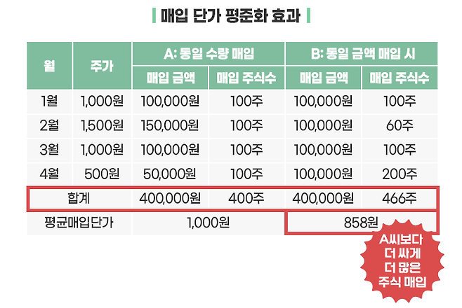 매달 10만 원씩을 투자한 B씨는 4달 동안 40만 원을 투자해서 466주(1월 100주, 2월 66주, 3월 100주, 4월 200주)를 매입했습니다. 1주당 평균매입단가는 858원이 됩니다. A씨보다 더 싸게, 더 많은 주식을 매입한 것이죠