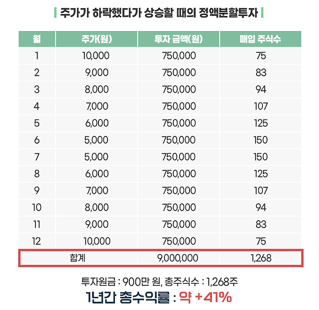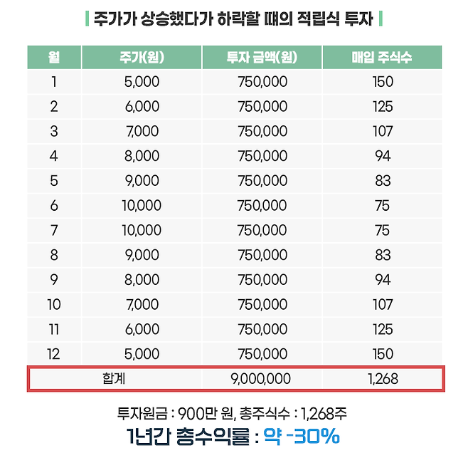 만약, 1월에 900만 원으로 5,000원의 주식을 한꺼번에 매입하고 1년이 지났다면 수익률은 그대로 0%가 되었을 것입니다. 이처럼 주가가 상승했다가 하락할 때는 오히려 역효과를 볼 수도 있습니다.