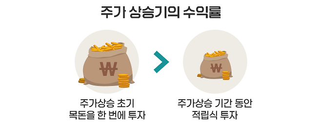 하지만 처음에 주가가 낮을 때 목돈을 한꺼번에 투자한 거치식 투자자의 수익률이 주가가 상승하는 동안 분할해서 주식을 매수한 적립식 투자자보다 훨씬 높을 수밖에 없습니다.