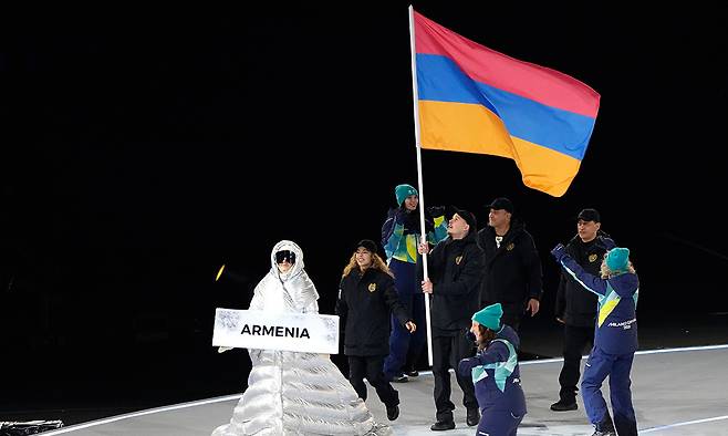 8일(현지시간) 영국 가디언에 따르면 아제르바이잔 국가올림픽위원회(NOC)는 6일 아르메니아 피겨 페어팀 카리나 아코포바(23)와 니키타 라흐마닌(27·사진 가운데)이 쇼트프로그램 음악 명칭으로 '아르차흐'를 썼다며 정치적 중립 원칙 위반을 지적했다.