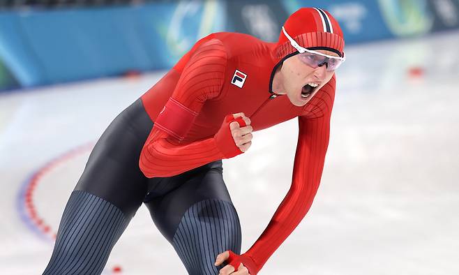 2주 전 세계 신기록을 쓴 노르웨이의 산데르 에이트렘(24·사진)이 올림픽 신기록도 세웠다. 에이트렘은 8일(현지시간) 이탈리아 밀라노 스피드스케이팅 스타디움에서 열린 2026 밀라노·코르티나담페초 동계 올림픽 스피드스케이팅 남자 5000m에서 6분03초95를 기록하고 금메달을 목에 걸었다. 에이트렘은 앞서 지난달 24일 ISU 스피드스케이팅 월드컵에서도 6분의 벽을 최초로 돌파하고 남자 5000m 세계 신기록(5분58초52)도 썼다. 노르웨이가 스피드스케이팅 남자 5000m에서 금메달을 수상한 건 1994년 이후 처음이다.