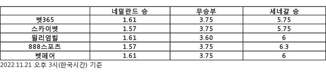 스카이벳은 네덜란드가 이기면 1.57배, 무승부면 3.75배, 세네갈이 이기면 5.75배로 돌려준다.