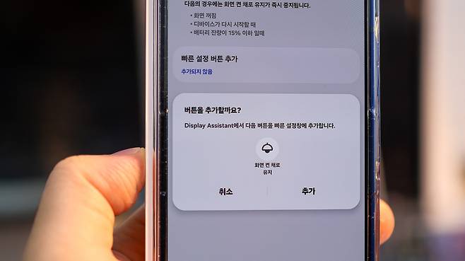 Display Assistant에서 화면 켠 채로 유지를 찾아 ON으로 바꾸면 됩니다. 이 설정이 켜지면 기본 디스플레이의 자동 꺼짐 최대 10분 대신 최대 30분으로 동작합니다.