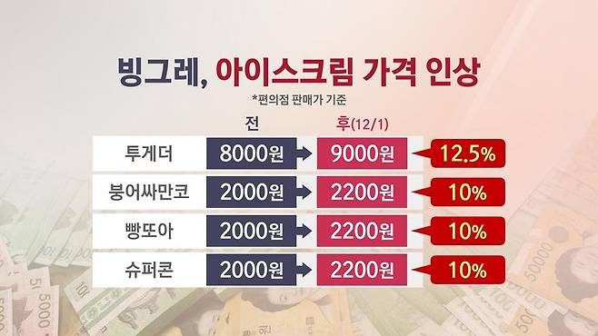 빙그레는 내년 1월 1일부터 투게더, 붕어싸만코, 슈퍼콘 등 인기제품 가격을 올리기로 했습니다.