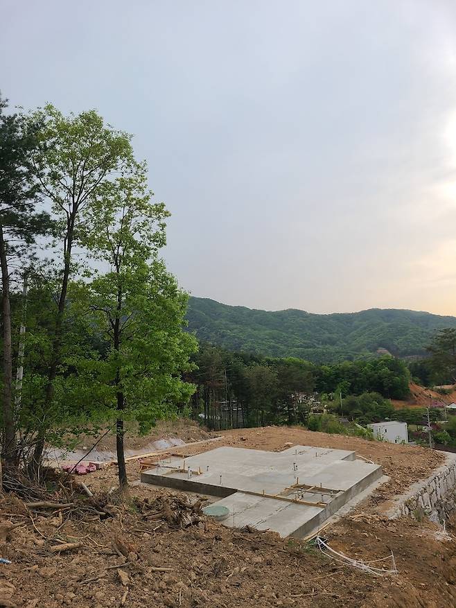 다음날부터 집을 지을 만한 지역을 정하고 열심히 땅을 보러 다녔어요. 출근하듯 다니며 백여 개가 넘는 곳을 보았지만 인연이 될 만한 땅은 찾지 못했습니다. 그렇게 지쳐갈 즈음.. 지금의 땅을 운명처럼 만나게 되었습니다. 산과 마을이 내려다보이고 탁 트인 전망이 아름다운 땅이었어요. 보는 순간 가슴이 설렜고 그 위에 지어질 집이 그려졌습니다. 그렇게 오랜 꿈이던 집 짓기가 시작되었습니다!ㅎ