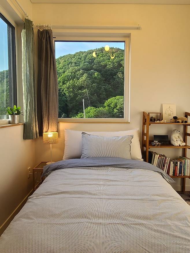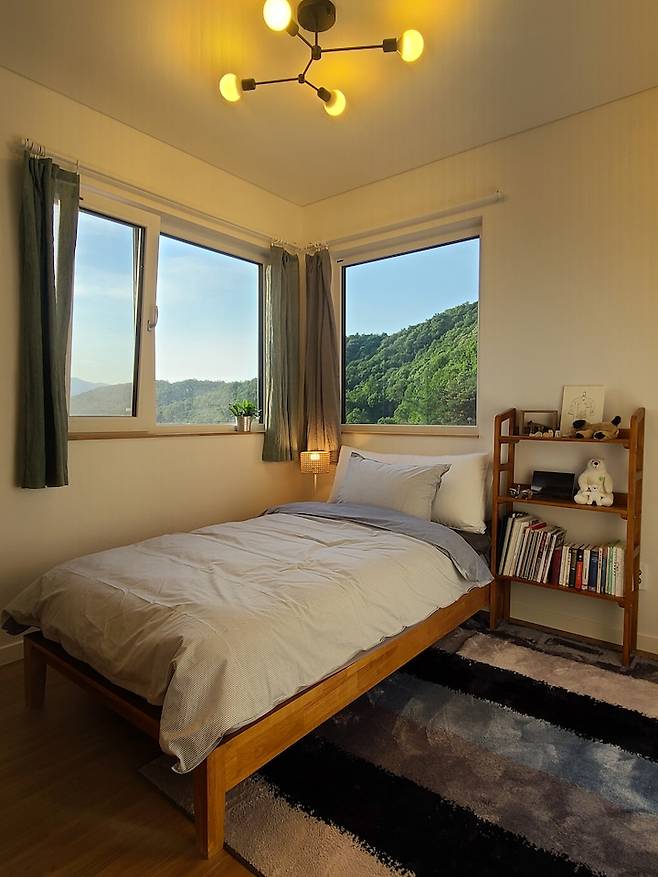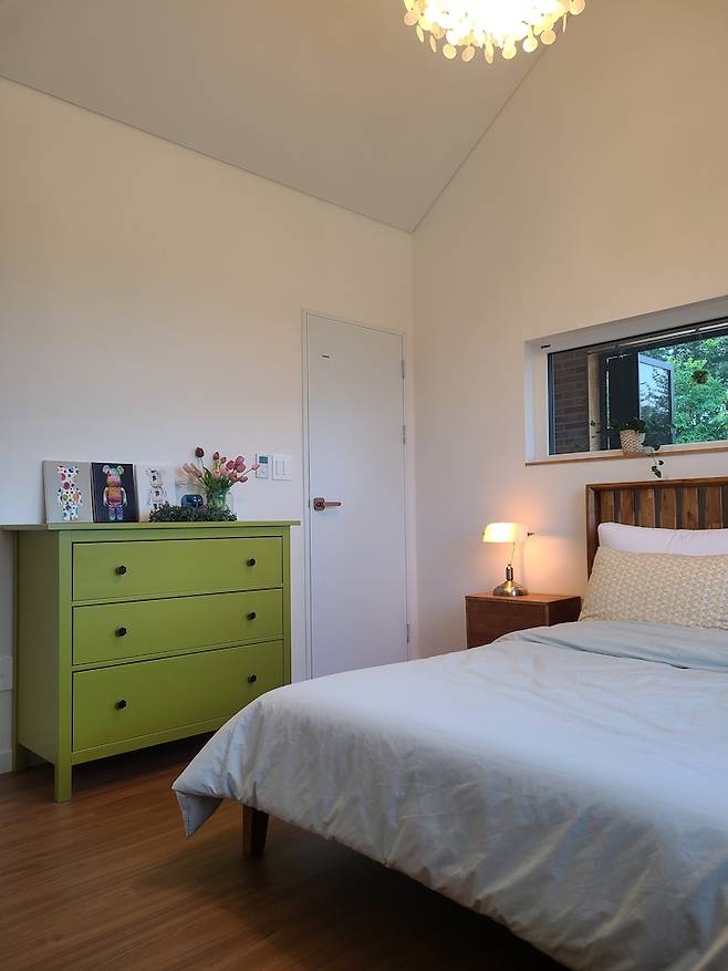 전에 살던 집에서 아들방이 습하고 추웠던 방이라, 새로 집을 지으면서는 뷰가 좋은 곳에 아들의 방을 내주고 싶었습니다. 그래서 두 개의 면으로 숲이 보이는 위치에 방을 배치하고, 각각의 방향으로 두 개의 창을 냈습니다.