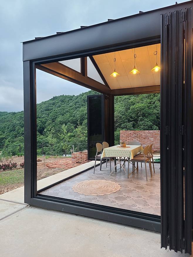 폴딩도어를 모두 열면 야외의 카페 분위기도 나구요~ 비가 오는 날이나 바람이 부는 날에는 폴딩도어를 모두 닫고 맘껏 전골을 끓이거나, 삼겹살을 구워요. 다 가능하답니다~~ㅎㅎ