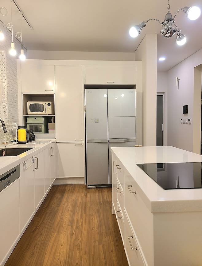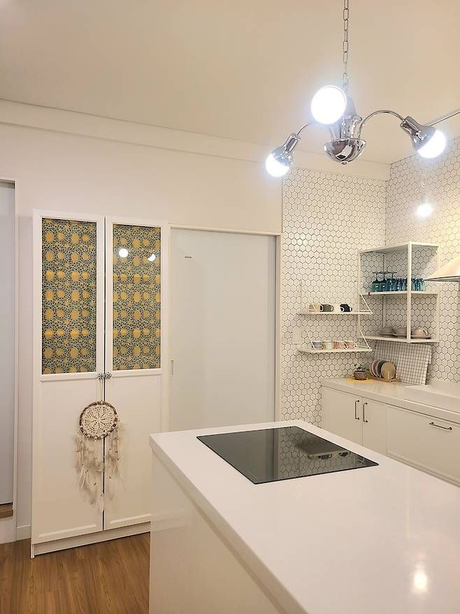 주방은 화이트라는 취향을 고수하고 있어서, 진짜로 올~화이트 주방이랍니다ㅎㅎ 다소 밋밋해질 수 있어서, 육각 타일로 포인트를 주었습니다~ㅎ