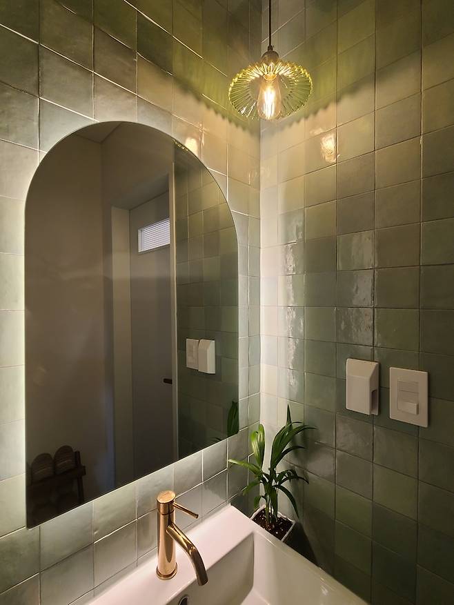 현관에 들어오자마자 있는 욕실은, 세면실과 화장실 두 공간으로 나누어져 있습니다~ 가볍게 손을 닦고 집안으로 들어올 수 있도록 동선을 고려했죠.ㅎ 거울은 간접조명이 있는 것으로 분위기를 내고~ 타일과 조명은 그린 색상으로 골랐습니다. 고르는데 고심한 만큼, 마음에 드는 공간이 되었답니다~~ㅎㅎ
