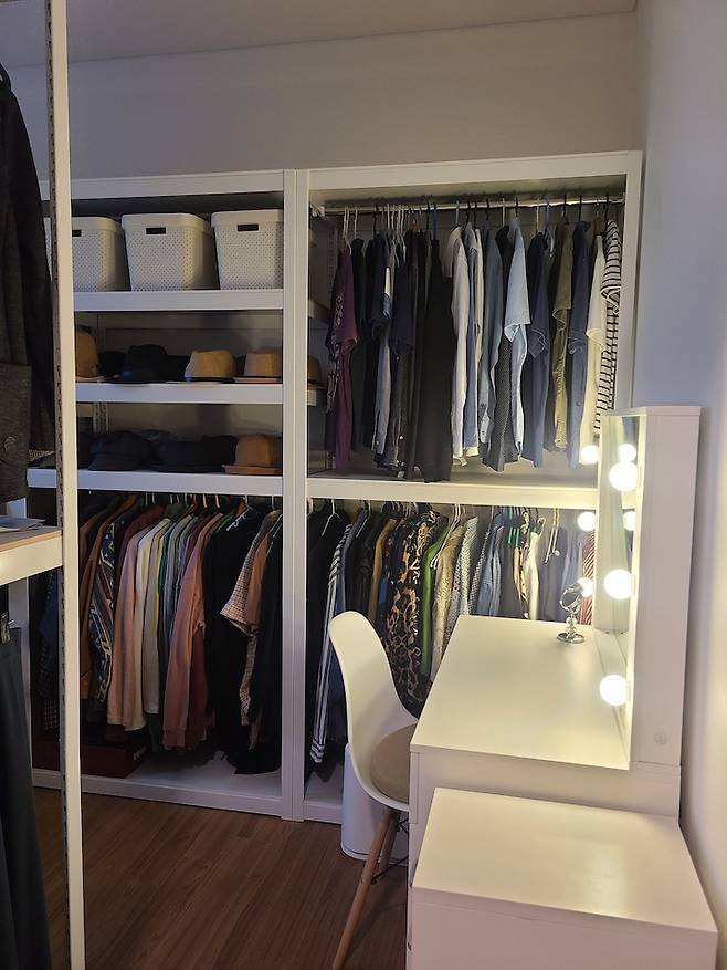 직접 조립해서 설치하고 사용 중인 드레스룸입니다. 모자를 좋아해서 모자를 두는 자리를 만들었구요~ 침구와 소소한 물건들도 수납하는, 크지는 않아도 쓰임새가 많은 곳이랍니다.ㅎ