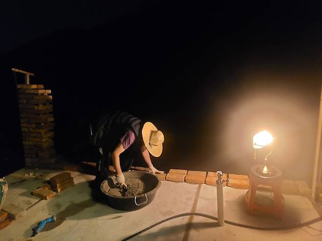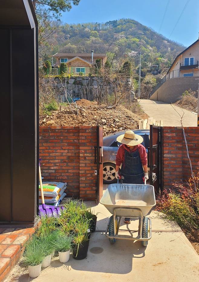 남은 벽돌이 많아서~ 둘이서 담장도 쌓아보기로 했습니다. 집 뒤쪽을 가려주는 작은 담장이었는데, 몸으로 하는 일 중에 가장 힘든 코스였답니다... 이번 생에 다시는 하지 않기로 했죠...^^;;;; 집 앞에 큰 담장을 쌓을 때~ 전문가분들의 손놀림으로는 절대 어렵지 않아 보였는데.. 직접 해 보니 이보다 힘들 수가요... ㅠㅠ;;)