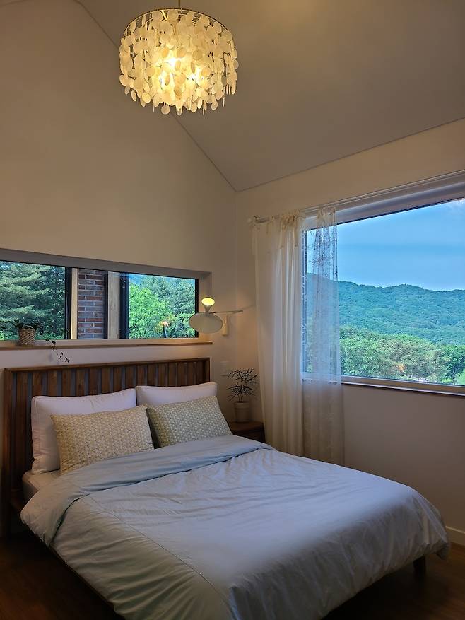 안방은 독립된 박공 지붕이라 천장도 시원해요. 그리고 자개로 된 조명이 바람에 찰랑거릴 땐 기분까지 좋아지죠~~^^ 창문으로 보이는 뷰 역시 좋은 안방이에요~ㅎ