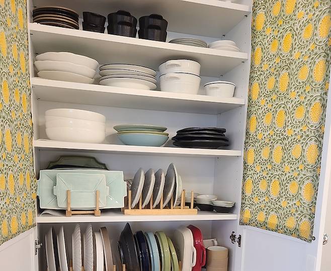 책장에 패브릭을 덧대어 스타일을 바꾸고, 손잡이도 새로 달아서~ 그릇장으로 완성했습니다.ㅎ 가려져 있어서 그릇을 많이 수납할 수 있고, 패브릭만 바꿔주면~ 분위기도 바꿔주기 좋아요~ㅎㅎ