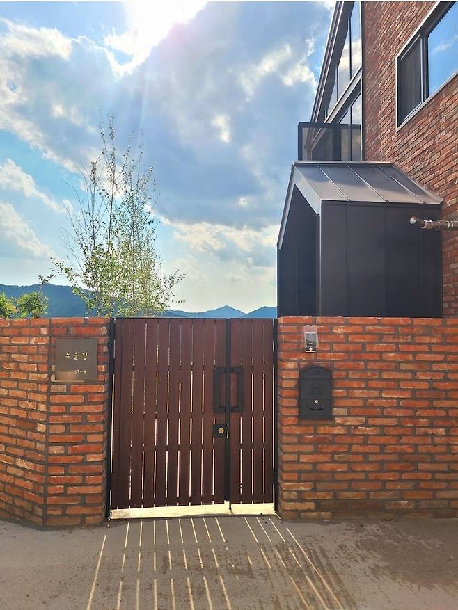 노을집 대문이에요. 집의 남향 쪽이 길을 향하고 있어서, 프라이빗하게 벽돌 담장을 쌓아올렸습니다. 덕분에 어울리는 대문까지 함께 완성되었죠~ 곧 능소화랑 넝쿨장미 안젤라가 담장 너머로 인사를 나갈 예정입니다~ㅎㅎ
