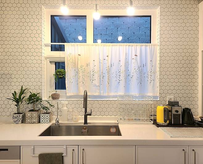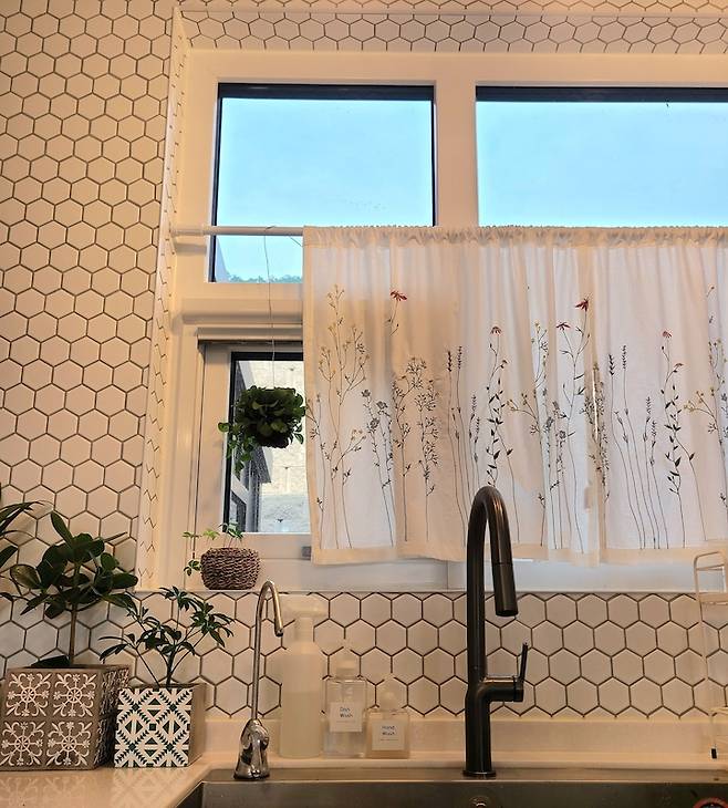 주방의 창은 동쪽으로 나서 아침에 빛이 예쁘게 들어오는데~ 외부에 노출되는 위치랍니다. ㅠㅠ;; 그래서 자수가 있는 긴 커튼을 사서 수선하고~ 중간에 걸어 주었죠.ㅎ 빛은 들어오고~ 프라이빗도 지켜지고~ 커튼도 예뻐서 만족이에요~~^^