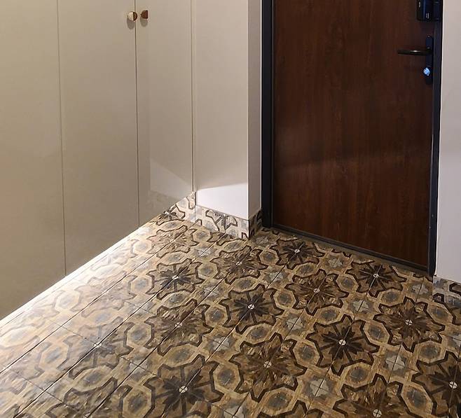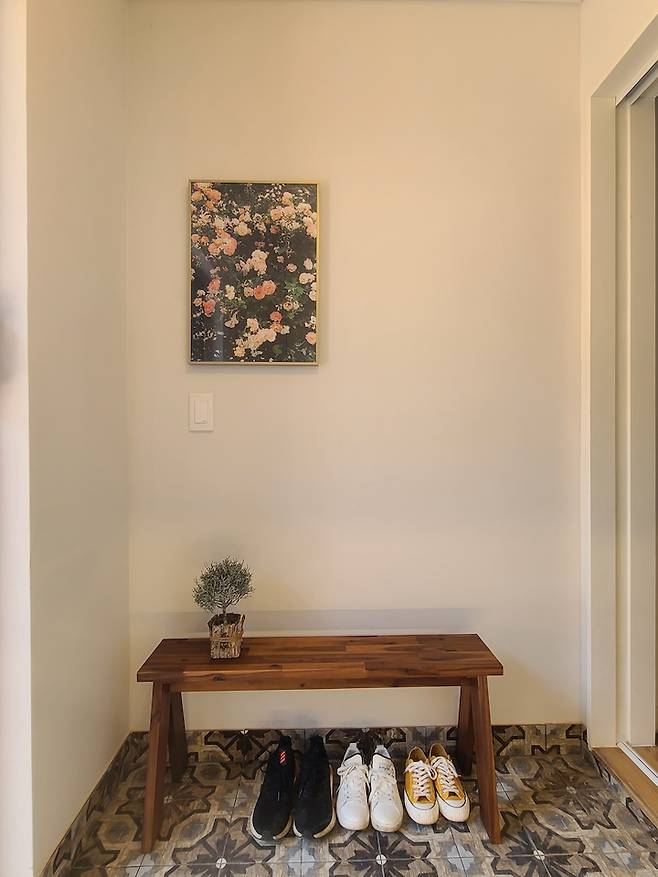 시골살이의 특성상 현관에 흙이 묻거나 쌓여도 도드라지지 않게 브라운 톤의 빈티지 타일을 선택했습니다. 신발을 신기 편하도록 벤치를 놓았구요~ㅎ 조금만 기다리면 문밖으로 더 무성해진 정원을 볼 수 있겠죠~~^^