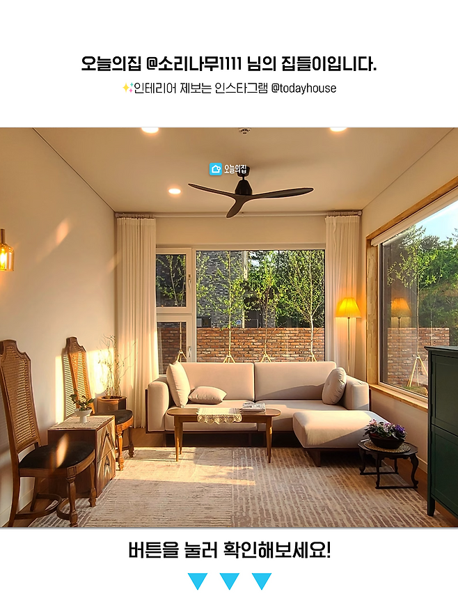 나른한 오후에 음악을 들으면서 쉬거나, 마당 일을 하다가 낮잠을 자기도 하는 공간이에요~ㅎ 앤티크 의자와 패브릭 소파를 함께 놓고, 오롯이 전망을 보면서 쉴 수 있도록 했습니다.^^ (저희 집 거실에는 TV가 없답니다.ㅎㅎ)