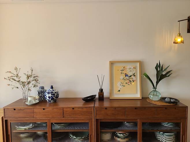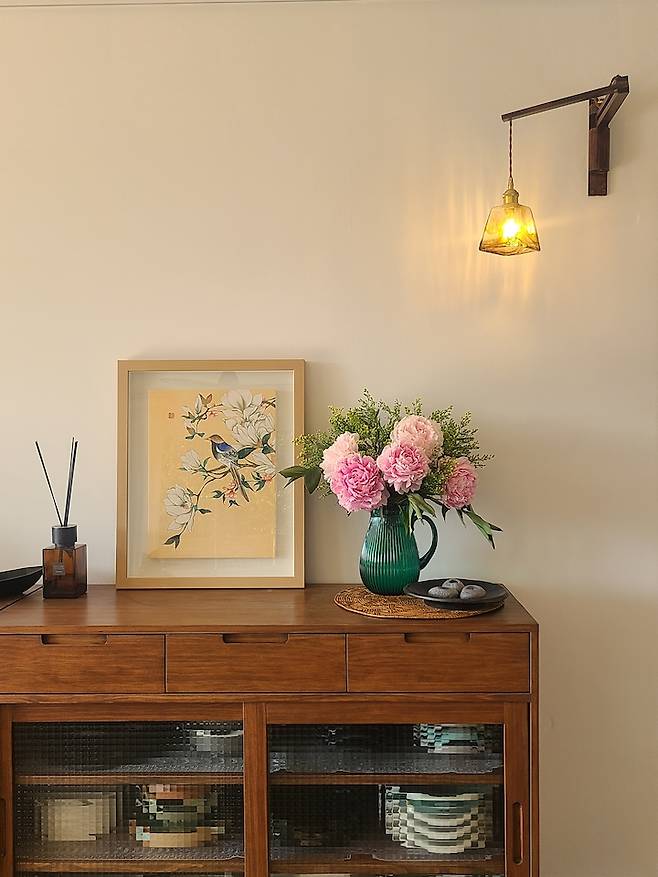 이 장식장은 그릇장으로 주문했는데 장식장으로서도 너무 훌륭한 역할을 해주고 있답니다. 모루 유리를 선택하고 깊은 색상으로 골라서~ 레트로 분위기가 나는 공간이 되었죠~~ㅎ 벽 등과 화병, 민화 작품이 어우러져 우리 집의 분위기를 완성해 주었습니다.^^